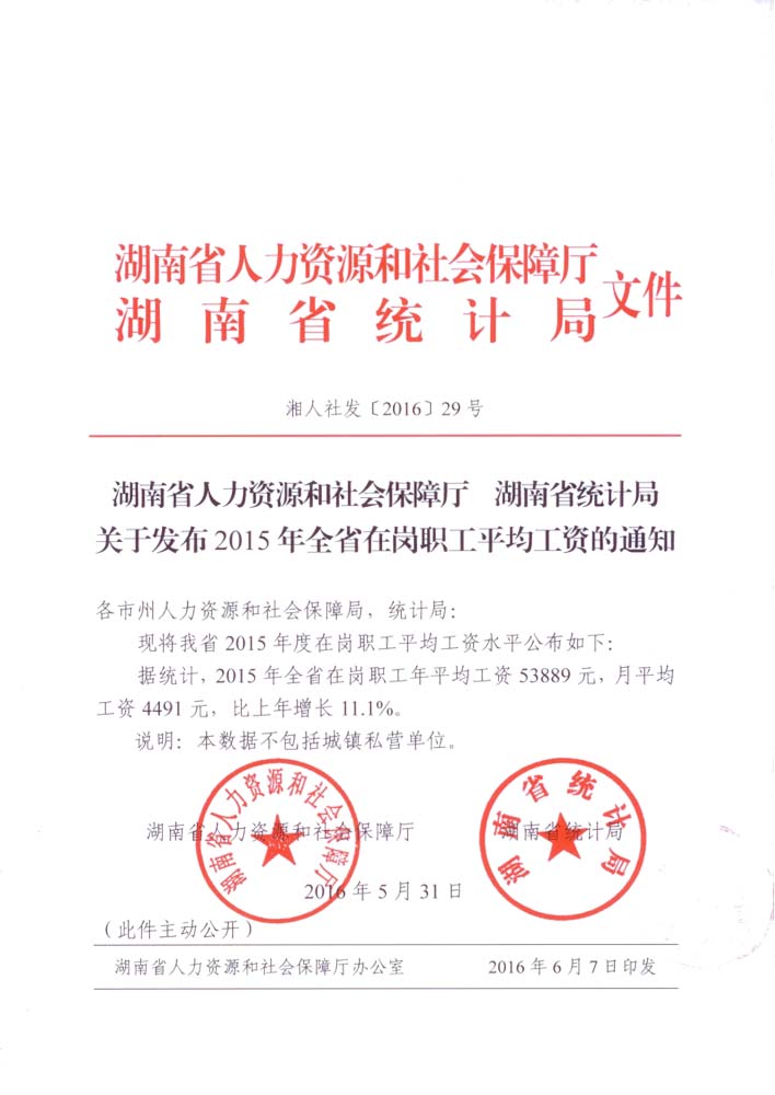 湖南省人力資源和社會(huì )保障廳,湖南省統計局關(guān)于發(fā)布2015年全省在崗職工平均工資的通知